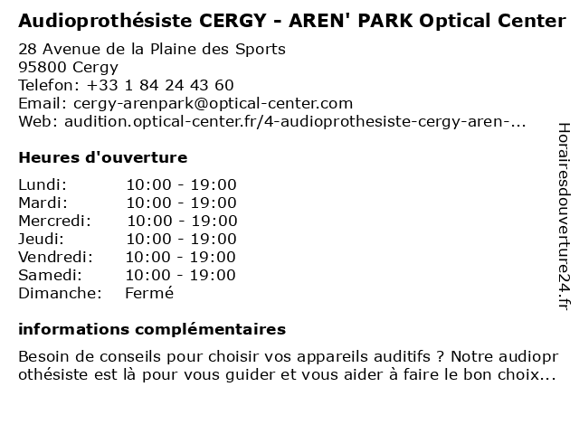 1 Opticien CERGY- AREN PARK Optical Center (Distance: 0,02 km) 28 Avenue de la Plaine des Sports, 95800 Cergy aren, center, cergy, optical, opticien, park 3 Crit Center (Distance: 1,28 km) 9 Chaussée Jules César, 95520 Osny batiment, center, crit, décoration, peinture 5 Manucure Esthétic Center (Distance: 3,05 km) 5 Rue de la Coutellerie, 95300 Pontoise beauté soins, center, esthétic, institut, manucure, onglerie 6 Optical Discount (Distance: 3,10 km) 1 Place du Général de Gaulle, 95300 Pontoise discount, lentilles de contact, lunettes de soleil, mode, optical, optique |