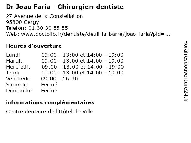 1 Dr Joao Vaz - Chirurgien-dentiste (Distance: 0,36 km) 21 Avenue de la Constellation, 95800 Cergy chirurgien, dent, dentiste, docteur, dr, joao, soins, vaz 2 Dr Joao Paquete - Chirurgien-dentiste (Distance: 10,27 km) 47 Avenue Paul Raoult, 78130 Les Mureaux chirurgien, dentiste, dr, joao, médecin, médecine, médical, paquete, pharmaceutique, traitement 3 Dr Joao Paquete - Chirurgien-dentiste (Distance: 10,73 km) 47 Avenue Paul Raoult, 78130 Les Mureaux chirurgien, dentaire, dentiste, dr, implantologie, joao, paquete, parodontologie 4 Dr Wafa Aroufi - Chirurgien-dentiste (Distance: 0,00 km) 27 Avenue de la Constellation, 95800 Cergy aroufi, buccale, bucco, carie, centre, chirurgie, chirurgien, dentaire, dentiste, dents, dr, hôtel, médecine, panoramique, radio, sagesse, ville, wafa 5 Dr Dahlia Tubiana - Chirurgien Dentiste (Distance: 1,14 km) 57 Avenue du Bontemps, 95800 Cergy blanchiments, carie, chirurgien, dahlia, dentaire, dentiste, dents, dr, détartrage, gouttière, orthodontie, panoramique, radio, stellite, tubiana 6 Dr Catherine Rossi - Chirurgien-dentiste (Distance: 28,65 km) 10 Rue de la Pépinière, 75008 Paris carie, catherine, chirurgien, consultation, dentiste, dr, médecin, orthodonthie, rossi, soins |
