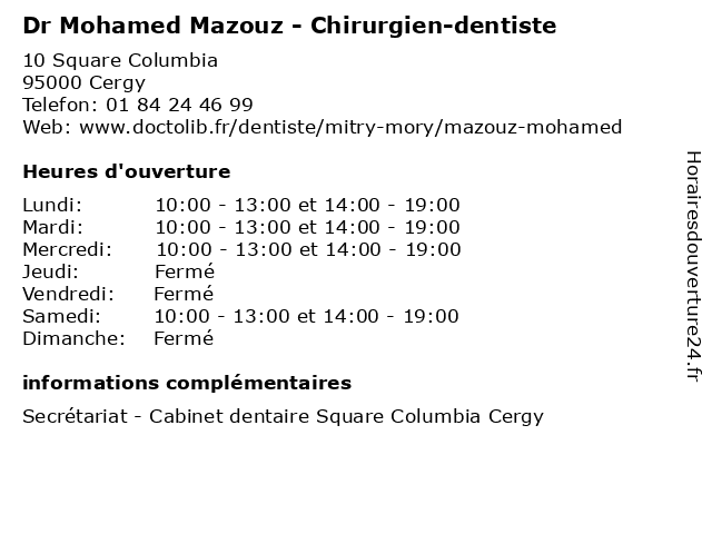 | Mercredi | 10:00-13:00 et 14:00-19:00 |