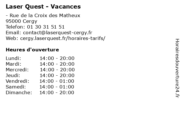 1 Laser Quest - Hors vacances (Distance: 0,00 km) - Rue de la Croix des Matheux, 95000 Cergy equipes, hors, indoor, jeux, laser, quest, stratégie, vacances 2 Laser Quest (Distance: 0,74 km) 3 Fontaines, 95003 Cergy-Pontoise cafe, chaussures, enfants, homme, laser, lingerie, mode femme, quest, restaurant 3 Still-Laser (Distance: 11,92 km) 97 Route de Cormeilles, 78500 Sartrouville découpe, entreprise, jerome, laser, still 4 Centre Laser et esthétique CLEA (Distance: 12,99 km) 19 Avenue de Paris, 95290 L'Isle-Adam centre, clea, dent, dentiste, docteur, esthétique, et, laser, soins 5 Still-Laser (Distance: 13,16 km) 35 Rue d'Estienne d'Orves, 78500 Sartrouville découpe, entreprise, laser, sartrouville, still 6 Centre de Médecine Esthétique et Epilation Laser de Saint Germain en LAye (Distance: 15,77 km) 28 Rue du Maréchal Joffre, 78100 Saint-Germain-en-Laye centre, de, en, epilation, esthétique, et, germain, laser, laye, médecine, saint |