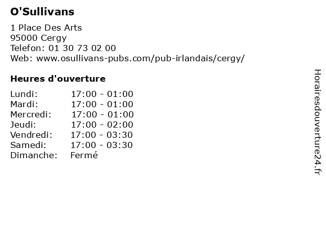 1 O'Sullivans Pub (Distance: 0,04 km) 1 Place des arts, 95000 Cergy bar, boissons, cergy, cocktail, musique, o'sullivans, pub, restauran 2 O'Sullivans Pub (Distance: 15,37 km) 3 Rue De Pontoise, 78100 St Germain En Laye bar, boissons, cocktail, germain, musique, o'sullivans, pub, restauran, st. 3 O'Sullivans Champs-Elysées, Paris 8 (Distance: 24,88 km) 63 Avenue Franklin Delano Roosevelt, 75008 Paris bar, bar sportif, bar-salon, champs, elysées, o'sullivans, paris, restaurants 4 O'Sullivans Pigalle (Distance: 25,06 km) 92 Boulevard De Clichy, 75018 Paris bar, bar sportif, bar-salon, boîte de nuit, club de danse, club de musique live, o'sullivans, pigalle, salle de concert 5 O'Sullivans Grands Boulevards (Distance: 26,61 km) 1 Boulevard Montmartre, 75002 Paris bar, bar sportif, boulevards, grands, o'sullivans, restaurants 6 O'Sullivans Pub (Distance: 26,62 km) 1 Boulevard Montmartre, 75002 Paris bar, boissons, boulevard, cocktail, grand, musique, o'sullivans, pub, restauran |
