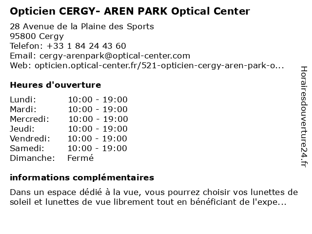 2 Audioprothésiste CERGY - AREN' PARK Optical Center (Distance: 0,02 km) 28 Avenue de la Plaine des Sports, 95800 Cergy aren', audioprothésiste, center, cergy, optical, park 3 Crit Center (Distance: 1,27 km) 9 Chaussée Jules César, 95520 Osny batiment, center, crit, décoration, peinture 6 Opticien Centre Médical (Distance: 1,74 km) 19 Avenue de la Constellation, 95800 Cergy centre, médical, opticien |