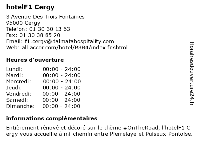 2 HotelF1 (Distance: 3,47 km) 98 Rue De Cergy, 78700 Conflans Sainte Honorine bar, hotelf1, restaurant, services 6 HotelF1 (Distance: 43,08 km) . Boulevard du Rû de Nesle, 93160 Noisy Le Grand bar, hotelf1, restaurant, services |
