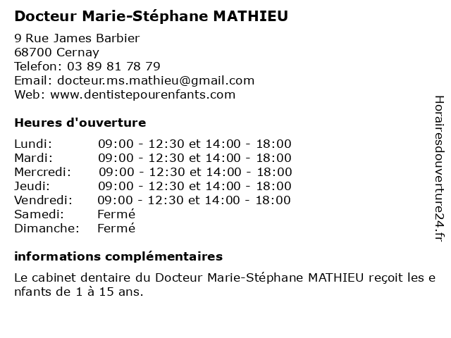 | Mercredi | 09:00-12:30 et 14:00-18:00 |