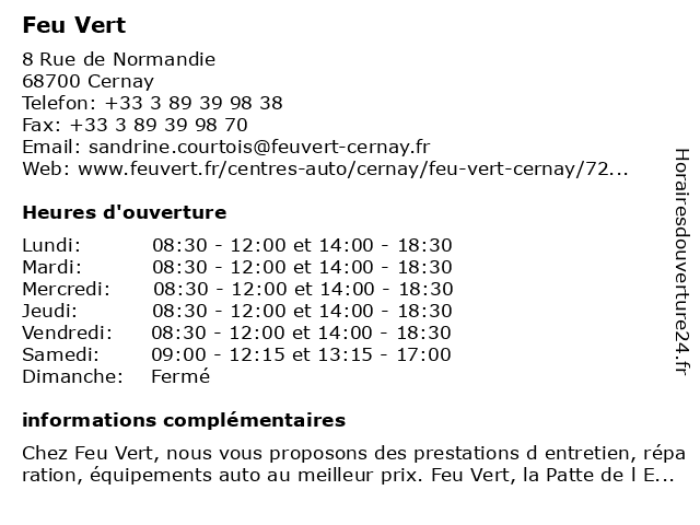 1 Feu Vert (Distance: 3,96 km) 8 Rue de Normandie, 68700 Cernay automobile, centre auto, dépannage, entretien, feu, garage, pneus, réparation, vert 2 Feu Vert (Distance: 10,68 km) - Rue Marcel Pagnol, 68270 Wittenheim automobilistes un entretien et des équipements de qualité, feu, motos et accessoires, vert, voitures 3 Uni Vert (Distance: 5,90 km) 24 Rue de la Hohmatten, 68310 Wittelsheim dalles, jardin, pavage, paysagiste, uni, vert 5 À l'Arbre Vert (Distance: 10,72 km) 24 Rue De Guebwiller, 68840 Pulversheim boissons, l'arbre, lionel, restaurants, vert, wetterer 6 Au Chasseur Vert (Distance: 10,94 km) 5 Rue De Guebwiller, 68260 Kingersheim au, bar, café, chasseur, restaurants, vert |