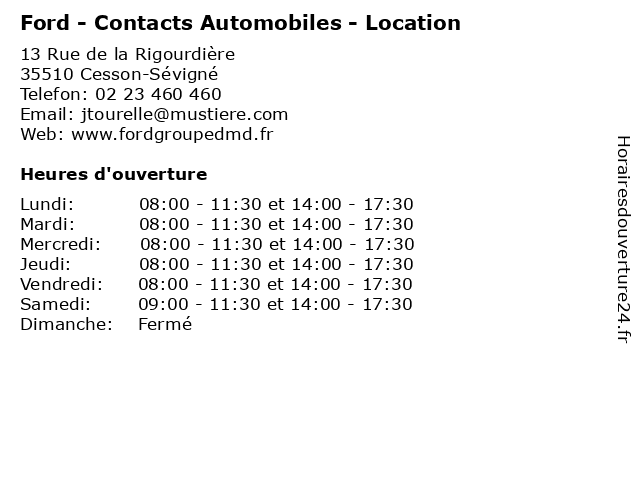 1 Ford - Contacts Automobiles - Location (Distance: 7,78 km) 272 Rue Saint-Malo, 35000 Rennes automobiles, contacts, ford, location, révisions, service, services, services d'automobiles 2 Ford - Contacts Automobiles - Véhicules Neufs (Distance: nan km) 13 Rue de la Rigourdière, 35510 Cesson-Sévigné automobiles, contacts, ford, neufs, révisions, service, services, services d'automobiles, véhicules 3 Ford - Contacts Automobiles - Véhicules d'Occasion (Distance: nan km) 13 Rue de la Rigourdière, 35510 Cesson-Sévigné automobiles, contacts, d'occasion, ford, révisions, service, services, services d'automobiles, véhicules 4 Ford - Contacts Automobiles - Ford Entreprise (Distance: nan km) 13 Rue de la Rigourdière, 35510 Cesson-Sévigné automobiles, contacts, entreprise, ford, révisions, service, services, services d'automobiles 5 Ford - Contacts Automobiles - Financement (Distance: nan km) 13 Rue de la Rigourdière, 35510 Cesson-Sévigné automobiles, contacts, financement, ford, révisions, service, services, services d'automobiles 6 Ford - Contacts Automobiles - Entretien (Distance: nan km) 13 Rue de la Rigourdière, 35510 Cesson-Sévigné automobiles, contacts, entretien, ford, révisions, service, services, services d'automobiles |