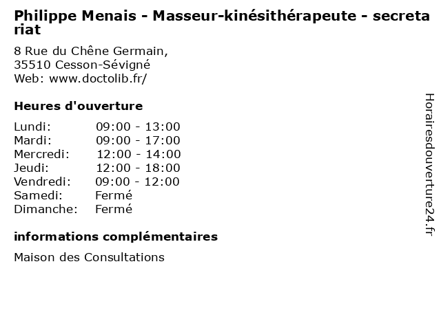 1 Isabelle Menais - Masseur-kinésithérapeute - secretariat (Distance: nan km) 8 Rue du Chêne Germain,, 35510 Cesson-Sévigné isabelle, kinésithérapeute, masseur, menais, médecin, médecine, médical, pharmaceutique, secretariat, traitement 2 Menais-Pommereuil Isabelle (Distance: 0,00 km) 8 Rue du Chêne Germain, 35510 Cesson-Sévigné isabelle, menais, pommereuil 3 Martin Philippe Joel (Distance: 4,61 km) 7 Rue De La Chalotais, 35000 Rennes joel, martin, philippe, restaurants 4 Medecin Philippe Kergosien (Chirurgien vasculaire) (Distance: 4,71 km) 6 Boulevard de la Boutiere, 35768 Saint-Gregoire chirurgien, docteur, kergosien, medecin, philippe, sante, services, vasculaire 5 Medecin Philippe Kergosien - Horaires du Cabinet (Chirurgien vasculaire) (Distance: 4,71 km) 6 Boulevard de la Boutiere, 35768 Saint-Gregoire cabinet, chirurgien, docteur, du, horaires, kergosien, medecin, philippe, sante, services, vasculaire 6 Poulain Philippe (Distance: 6,86 km) 4 Impasse De Bradigan, 35530 Noyal Sur Vilaine philippe, poulain, restaurants |