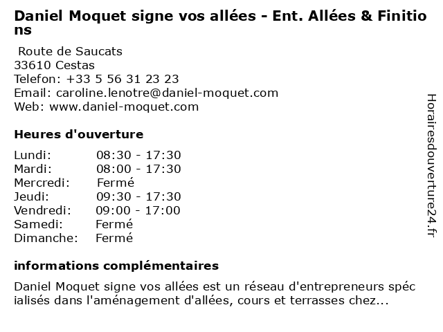 1 Daniel Moquet signe vos jardins - Ent. Kaci (Distance: 0,06 km) Route de Saucats, 33610 Cestas crédit d'impôt, daniel, daniel moquet jardins, daniel moquet paysagiste, débrousaillage, désherbage, engazonnement, ent., entreprise entretien jardin, entretien, espaces verts, gazon de placage, jardinier, jardins, kaci, massif paysager, moquet, nettoyage, paysagiste, paysagiste jardin, signe, taille, taille de haies, tonte de pelouse, vos, élagage 2 Daniel Moquet signe vos allées - Ent. Seguy (Distance: 15,93 km) 6 Rue Jacquard, 33700 Mérignac allée, allées, aménagement extérieur, aménagement plage de piscine, aménagement terrasse, béton, cour, cour drainante, dallage, daniel, daniel moquet allées, enrobé, ent., entrée de garage, entrée de maison, gazon synthétique, gravillon, moquet, pavage, paysagiste, revêtement, seguy, signe, terrasse, tour de piscine, vos 3 PRO&Cie - Ent. Merignac Services (Distance: 16,61 km) Rue Galilée, 33185 Le Haillan ent., merignac, pro&cie, services 6 Onepark / Parc Allées de Chartres Parking (Distance: 19,27 km) 19 Allée de Chartres, 33000 Bordeaux allées, chartres, de, onepark, parc, parking, services |