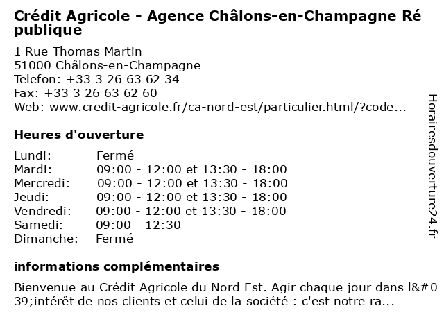 1 Crédit Agricole - Banque Privée Châlons-en-Champagne (Distance: 0,00 km) 1 Rue Thomas Martin, 51000 Châlons-en-Champagne agricole, banque, champagne, châlons, crédit, en, privée 2 Pharmacie 52 République (Distance: 0,08 km) 52 Place de la République, 51000 Châlons-en-Champagne 52, pharmacie, république 3 Boulangerie de la République (Distance: 0,13 km) 3 Place de la République, 51000 Châlons-en-Champagne baguettes, boulangerie, de, la, pains, restauration, république, viennoiserie 4 Crédit Agricole (Distance: 1,25 km) . Avenue du Président Roosevelt, 51000 Châlons-en-Champagne agricole, cafe, chaussures, crédit, enfants, homme, mode femme, restaurant, service, sport 5 Crédit Agricole - Agence Saint-Memmie (Distance: 1,60 km) Rue de Poix, 51470 Saint-Memmie agence, agricole, crédit, memmie, saint 6 Crédit Agricole Du Nord Est (Distance: 1,80 km) 44 Avenue du 106ème Régiment d'Infanterie, 51000 Châlons-en-Champagne agricole, crédit, du, est, nord |