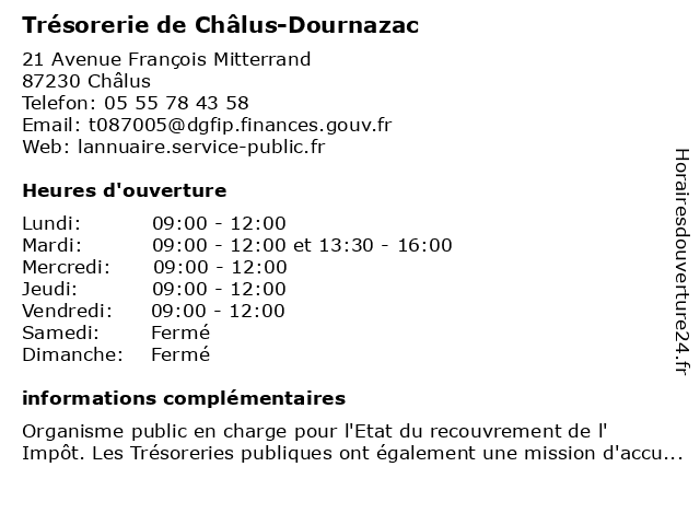 Termes de recherche pour Trésorerie de Châlus-Dournazac:de, administration, finances, trésor, impôts, public, trésorerie, publiques, châlus, dournazac |
