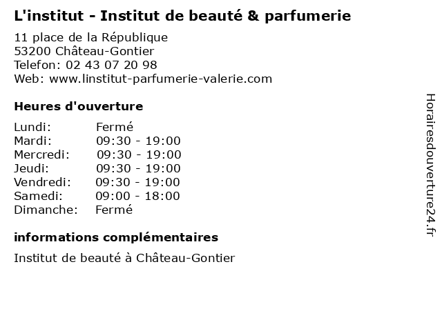 1 Vital Beauté (Distance: 1,67 km) 41 chemin de la Guesnardière, 53200 Château-Gontier beauté, institut, manucure, massage, soins, vital, épilation 2 La Cabane Beauté (Distance: 2,71 km) 23 Rue Julien Gourdon, 53200 Château-Gontier-sur-Mayenne beauté, cabane, la 4 Institut Instant Détente (Distance: 17,86 km) 20 Route de Laval, 53170 Meslay-du-Maine beaute, détente, instant, institut, produits, sante 5 Relax & Douceur Institut (Distance: 18,38 km) 5 place des Halles, 53400 Craon beauté, douceur, institut, manucure, massage, relax, soins, épilation 6 Nocibé (Distance: 29,95 km) - Route du Mans, 72300 Sable sur Sarthe beauté, boutique, institut, magasin, nocibé, parfum, parfumerie, santé, soins |