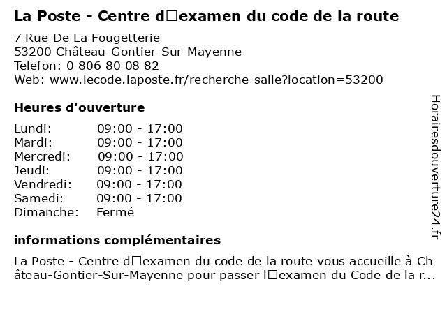 Termes de recherche pour La Poste - Centre d’examen du code de la route:poste, la, du, de, route, centre, code, d’examen, centre d'évaluation scolaire, école technique |