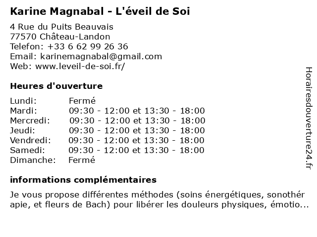 | Mardi | 09:30-12:00 et 13:30-18:00 |