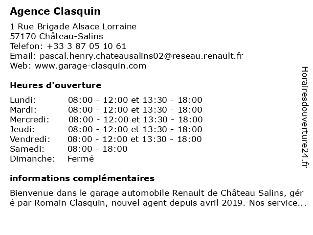 Bienvenue dans le garage automobile Renault de Château Salins, géré par Romain Clasquin, nouvel agent depuis avril 2019. Nos services: -entretien et réparation toutes marques -vente véhicules ...
