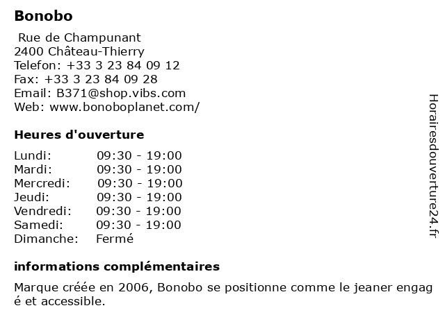 | 1 Vib's (Cache Cache - Bonobo - Bréal) (Distance: 0,15 km) Rue de Champunant, 02400 Château-Thierry bonobo, bréal, cache, vib's 2 Vib's (Cache Cache - Bonobo - Bréal) (Distance: 0,15 km) Rue de Champunant, 02400 Château-Thierry blazer femme, bonobo, boutique vêtement, bréal, cache, cardignan femme, chaussures femme, gilet femme, jean femme, jean homme, magasin vêtement, magasin vêtements mixte, manteau femme, manteau homme, mode femme, pull femme, pull homme, robe femme, sac femme, t-shirt femme, t-shirt homme, tailleur femme, top femme, vib's, vêtement femme, vêtement homme, vêtement mixte 5 Bonobo (Distance: 38,63 km) 3 Avenue Roland, 77124 Chauconin Neufmontiers bonobo, cafe, chaussures, femme, homme, mode, restaurant 6 |