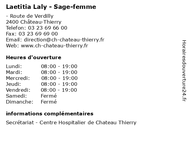1 Dr Céline Laly - Chirurgien-dentiste (Distance: 0,90 km) 9 Rue Vallée, 02400 Château-Thierry chirurgien, céline, dent, dentiste, docteur, dr, laly, soins 3 Bertin Martin Laetitia (Distance: 31,05 km) 11 Rue Victor Plessier, 77320 La Ferte Gaucher bertin, laetitia, martin, restaurants 4 Dr Laetitia Baillat - Médecin généraliste (Distance: 34,18 km) 4 Rue Gabriel Peri, 77120 Coulommiers baillat, consultation, docteur, dr, généraliste, laetitia, med, médecin, traitement 5 Laetitia Piris Varlet - Infirmière - secretariat (Distance: 54,51 km) 16b Rue Cornilliot,, 77400 Thorigny-sur-Marne infirmière, laetitia, médecin, médecine, médical, pharmaceutique, piris, secretariat, traitement, varlet 6 Laetitia Labrousse - Pédicure-podologue (Distance: 54,66 km) 124 Ter Rue de Claye, 77400 Thorigny-sur-Marne labrousse, laetitia, orthoplastie, podologue, pédicure, pédicurie |
