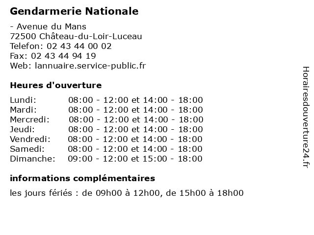 1 Gendarmerie Nationale (Distance: 10,64 km) 19 Rue du 11 Novembre 1918, 72800 Aubigné-Racan brigade, commandant, communauté, gendarme, gendarmerie, nationale, proximité, sécurité 2 Gendarmerie Nationale (Distance: 12,35 km) 1 Avenue du 14 Juillet, 72360 Mayet brigade, commandant, communauté, gendarme, gendarmerie, nationale, proximité, sécurité 3 Gendarmerie Nationale (Distance: 12,94 km) 4 Route du Stade, 72340 La Chartre-sur-le-Loir brigade, commandant, communauté, gendarme, gendarmerie, nationale, proximité, sécurité 4 Gendarmerie Nationale (Distance: 17,25 km) 10 Route de Tours, 72220 Écommoy brigade, commandant, communauté, gendarme, gendarmerie, nationale, proximité, sécurité 5 Gendarmerie Nationale (Distance: 18,24 km) 13 Rue Jean d'Alluye, 37330 Château-la-Vallière brigade, commandant, communauté, gendarme, gendarmerie, nationale, proximité, sécurité 6 Gendarmerie Nationale (Distance: 18,31 km) 1 Rue de Belleville, 72150 Grand-Lucé brigade, commandant, communauté, gendarme, gendarmerie, nationale, proximité, sécurité |