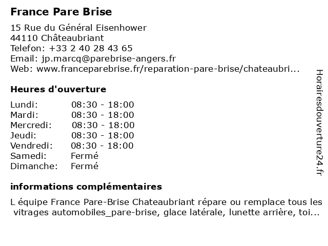 1 France Pare Brise (Distance: 0,43 km) 1 Rue du president kennedy, 44110 Chateaubriant brise, chateaubriant, france, pare, vehicule 2 Rapid Pare-Brise (Distance: 0,46 km) 34 rue de 8 mai 1945, 44110 Châteaubriant bris de glaces, brise, centres, changement, pare, pare brise, rapid, réparation 3 Mondial Pare-Brise (Distance: 1,50 km) 5 Boulevard de la République, 44110 Châteaubriant brise, mondial, pare 4 A+GLASS CHATEAUBRIANT (Distance: 0,61 km) 18 Rue Charles Lindbergh, 44110 Châteaubriant a+glass, aplusglass, automobile, bris de glace, camion, centres a+glass, chateaubriant, eclairage, france, pare-brise, parebrise 6 France Pare Brise (Distance: 48,19 km) . Impasse Jacqueline Auriol, 35136 Saint-Jacques-de-la-Lande bris de glace, brise, france, pare, pare brise, services |