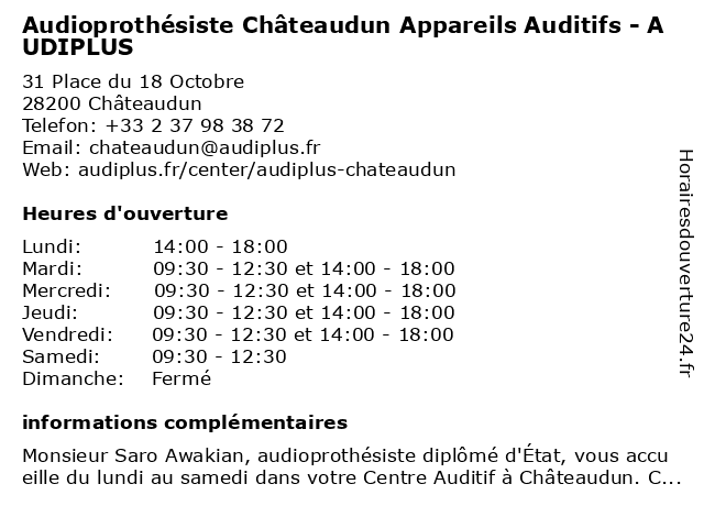 1 Audika - Audioprothésiste Chateaudun (Distance: 0,24 km) 37 Rue de la République, 28200 Châteaudun appareil auditif, audika, audiologiste, audioprothésiste, centre auditif, chateaudun, spécialiste audition 2 Audilab / Audioprothésiste Saint-Denis-Lanneray (Distance: 2,07 km) Route de la Varenne, 28200 Saint-Denis-Lanneray audilab, audioprothésiste, denis, lanneray, saint 3 Audilab / Audioprothésiste Cloyes-sur-le-Loir (Distance: 10,78 km) 34 Rue nationale, 28220 Cloyes-les-Trois-Rivières audilab, audioprothésiste, cloyes, le, loir, sur 4 Audilab / Audioprothésiste Brou (Distance: 19,62 km) 26 Rue de la Chevalerie, 28160 Brou audilab, audioprothésiste, brou 5 Audilab / Audioprothésiste Brou (Distance: 19,62 km) 26 Rue de la Chevalerie, 28160 Brou audilab, audioprothésiste, brou 6 Audilab / Audioprothésiste Brou (Distance: 19,62 km) 26 Rue de la Chevalerie, 28160 Brou audilab, audioprothésiste, brou |