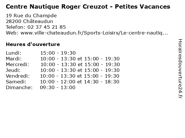 1 Centre Nautique Roger Creuzot - Périodes Scolaires (Distance: 0,00 km) 19 Rue du Champde, 28200 Châteaudun centre, creuzot, natation, nautique, piscine, période, périodes, roger, scolaire, scolaires 2 Centre Nautique Roger Creuzot - Grandes Vacances (Distance: 0,00 km) 19 Rue du Champde, 28200 Châteaudun centre, creuzot, grandes, natation, nautique, piscine, roger, vacances 3 Centre Nautique Des 3 Rivières - Période scolaire (Distance: 9,85 km) 16 Route de Montigny, 28220 Cloyes-sur-le-Loir aqua, aquatique, centre, des, nautique, piscine, période, rivières, scolaire 4 Centre Nautique Des 3 Rivières - Petites vacances (Distance: 9,85 km) 16 Route de Montigny, 28220 Cloyes-sur-le-Loir aqua, aquatique, centre, des, nautique, petites, piscine, rivières, vacances 5 Centre Nautique Des 3 Rivières - Grandes vacances (Distance: 9,85 km) 16 Route de Montigny, 28220 Cloyes-sur-le-Loir aqua, aquatique, centre, des, grandes, nautique, piscine, rivières, vacances 6 École primaire publique Roger Bellon (Distance: 10,35 km) 81 Grande rue, 28220 Romilly Sur Aigre bellon, cours, primaire, publique, roger, services, école |