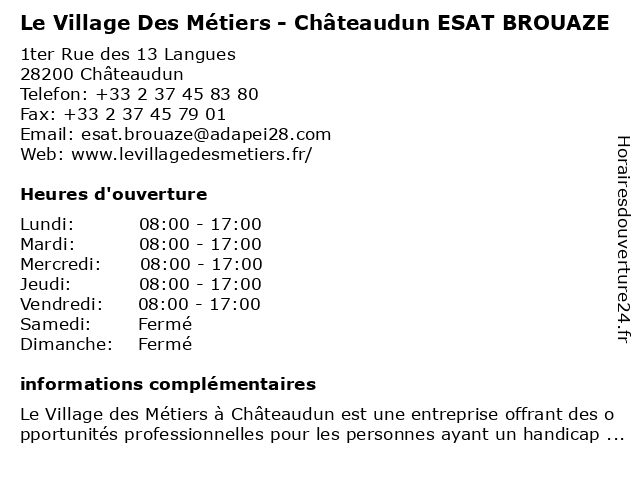 Termes de recherche pour Le Village Des Métiers - Châteaudun ESAT BROUAZE:le, village, des, metiers, châteaudun, esat, brouaze |