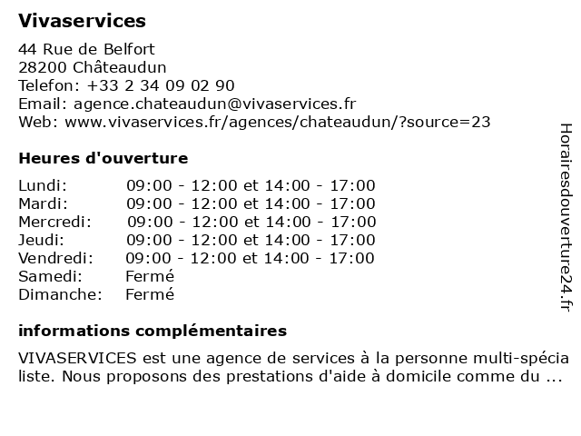 1 Vivaservices (Distance: 0,11 km) 22 place du 18 octobre, 28200 Chateaudun agées, aide, domicile, handicap, la, ménage, particuliers, personne, personnes, services, vivaservices |