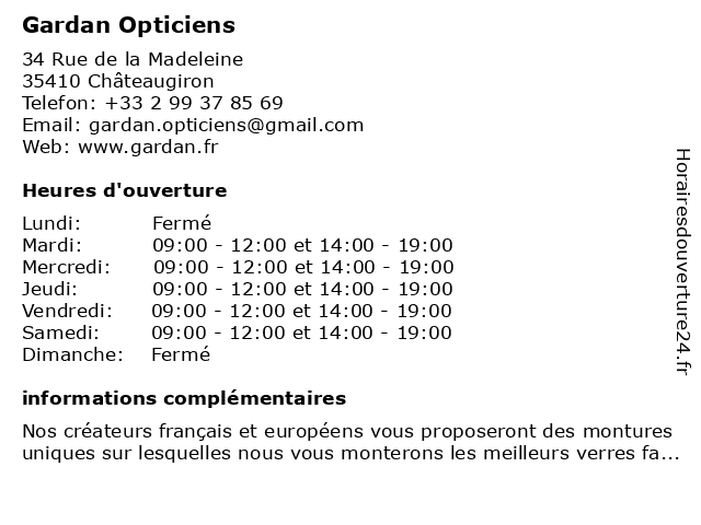 | Samedi | 09:00-12:00 et 14:00-19:00 |