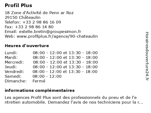 2 Coiffure Profil Et Harmony (Distance: 23,97 km) 22 Rue Laennec, 29710 Plonéis coiffure, et, harmony, profil 3 Profil Plus (Distance: 33,52 km) . Avenue Foch, 29400 Landivisiau batteries, centres auto, garage, plus, profil 5 Eco Plus (Distance: 36,65 km) 14 Rue du Docteur Menguy, 29270 Carhaix-Plouguer eco, funéraire, monuments, plus, services 6 |