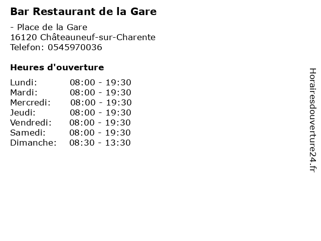 1 Gare Châteauneuf sur Charente - Guichet (Distance: 0,00 km) s/n place de la gare, 16120 Châteauneuf sur Charente charente, châteauneuf, gare, guichet, guichets, services, station, sur 2 Gare Châteauneuf sur Charente (Gare) (Distance: 0,14 km) s/n place de la gare, 16120 Châteauneuf sur Charente charente, châteauneuf, gare, services, station, sur 3 Gare de Jarnac Charente - Guichet (Distance: 13,17 km) - rue de la Gare, 16200 Jarnac charente, commun, de, en, ferroviaire, gare, guichet, jarnac, sncf, ter, tgv, train, transports 4 Le Domino Bar Brasserie (Distance: 13,19 km) 9 Rue des Fossés, 16200 Jarnac bar, bistro, bistrot, brasserie, café, domino, le, pub, restaurant, restauration, resto 5 Bar Tabac Le Jeanneteau (Distance: 13,21 km) 4 Rue Pierre Frapin, 16130 Segonzac bar, jeanneteau, le, tabac 6 Bar Restaurant L'Arrivée (Distance: 13,34 km) 35 avenue des Anciens Combattants, 16470 Saint-Michel bar, buffet, café, l'arrivée, restaurant, routier, à volonté |