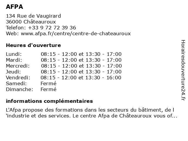 1 Afpa (Distance: 0,19 km) 134 rue de Vaugirard, 36000 Chateauroux afpa, agence, emploi, formation afpa, professionnelle 2 Afpa (Distance: 27,85 km) s/n rue Georges Brassens, 36100 Issoudun afpa, agence, emploi, formation afpa, professionnelle |