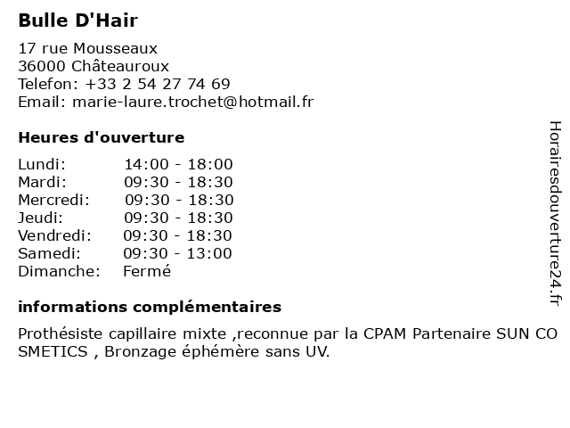 4 Ciseaux Dans L'Hair (Distance: 1,18 km) 154 Avenue Marcel Lemoine, 36000 Châteauroux ciseaux, dans, l'hair 6 Bulle d'Air Services (Distance: 4,67 km) 6 Allée des Haies Fleuries, 36330 Le Poinçonnet bulle, d'air, services |