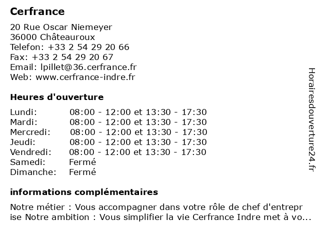 1 CERFRANCE Châteauroux (Distance: 0,33 km) 24 Rue des Ingrains, 36000 Châteauroux cerfrance, châteauroux 3 Cerfrance - Expertise Comptable (Distance: 28,94 km) . Z.A.C. des Coinchettes, 36100 Issoudun aide, argent, cerfrance, comptable, conseil, entreprises, expertise, finances, fiscalite, projet 4 Cerfrance Indre A.G.C. Indre (Distance: 41,72 km) 12 Rue des Templiers, 36600 Valençay a.g.c., cerfrance, indre 5 Cerfrance - Expertise Comptable (Distance: 45,95 km) . Avenue de la Gare, 18370 Châteaumeillant aide, argent, cerfrance, comptable, conseil, entreprises, expertise, finances, fiscalite, projet 6 Cerfrance - Expertise Comptable (Distance: 52,11 km) 1 avenue du Val d'Arnon, 18120 Méreau aide, argent, cerfrance, comptable, conseil, entreprises, expertise, finances, fiscalite, projet |