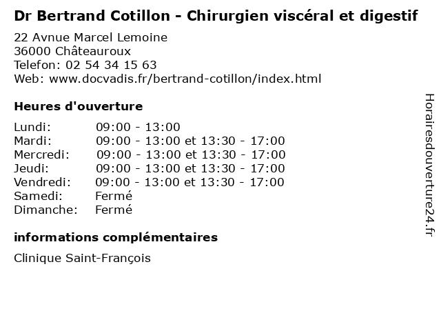 1 Dr Dominique Cotillon Dupoux - Médecin généraliste (Distance: 0,06 km) 22 avenue Marcel Lemoine, 36000 Chateauroux consultation, cotillon, docteur, dominique, dr, dupoux, généraliste, med, médecin, médecine, traitement 2 Dr Caesar Murgu - Chirurgien viscéral et digestif (Distance: 0,06 km) 22 Avenue Marcel-Lemoine, 36000 Chateauroux caesar, chirurgien, digestif, docteur, dr, et, général, medecin, murgu, sante, services, viscéral 3 Dr Adam Batoko - Chirurgien généraliste et digestif (Distance: 1,93 km) 216 Avenue de Verdun, 36000 Châteauroux adam, batoko, ch, chirurgie, chirurgien, châteauroux, de, digestif, disgestive, dr, et, foie, glandes, généraliste, site, viscerale 4 Dr Rabbah Dahmani - Chirurgien généraliste et digestif (Distance: 1,93 km) 216 Avenue de Verdun, 36000 Châteauroux ch, chirurgie, chirurgien, châteauroux, dahmani, de, digestif, disgestive, dr, et, foie, glandes, généraliste, rabbah, site, viscerale 5 Dr Alexis Vinet - Chirurgien généraliste et digestif (Distance: 1,93 km) 216 Avenue de Verdun, 36000 Châteauroux alexis, ch, chirurgie, chirurgien, châteauroux, de, digestif, disgestive, dr, et, foie, glandes, généraliste, site, vinet, viscerale 6 Graineterie Bertrand (Distance: 22,45 km) Zone Artisanale Les Terres Rouges, 36500 Buzançais bertrand, détail, graineterie, jardinage, magasins, pépinières, vente |