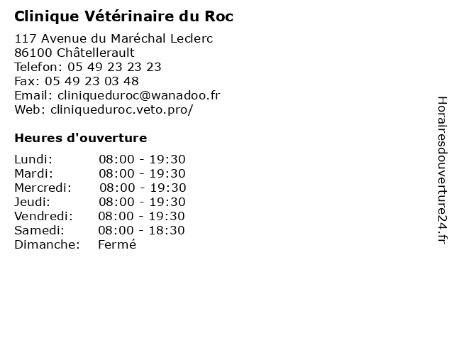 1 Clinique Vétérinaire Du Roc (L’accueil Est Ouvert) (Distance: 0,70 km) 117 Avenue Du Maréchal Leclerc, 86100 Châtellerault chirurgie, clinique, du, est, interne, l’accueil, médecine, orthopédie, ouvert, roc, vétérinaire 2 Clinique Vétérinaire Du Roc (Consultations Sur Rendez Vous) (Distance: 0,70 km) 117 Avenue du Maréchal Leclerc, 86100 Châtellerault chirurgie, clinique, consultations, du, interne, médecine, orthopédie, rendez, roc, sur, vous, vétérinaire 3 Centre de Vaccination COVID-19 - Clinique (Distance: 0,88 km) 17 Rue de Verdun, 86100 Châtellerault 19, centre, clinique, covid, covid 19, covid19, de, médecin, médecine, médical, test, vaccin, vaccination, vaccins 4 Pompes funèbres ROC-ECLERC (Distance: 2,15 km) 5 Rue de Jussieu, 86100 Châtellerault articles funéraires, assistance rapatriement, démarches admnistratives, eclerc, fleurs fraîches, funèbres, gestion des obsèques, pompes, prévoyance obsèques, roc, travaux de marbrerie et cimetière 5 Clinique Vétérinaire Fatoux Proton SCP (Distance: 2,57 km) 47 Avenue Camille Pagé, 86100 Châtellerault clinique, fatoux, proton, scp, vétérinaire 6 Cabinet Vétérinaire des 3 Clochers (Distance: 14,16 km) 19 rue Charles Marchand, 86230 Saint-Gervais-Les-Trois-Clochers cabinet, chat, chien, clochers, consultation, des, nac, vétérinaire |