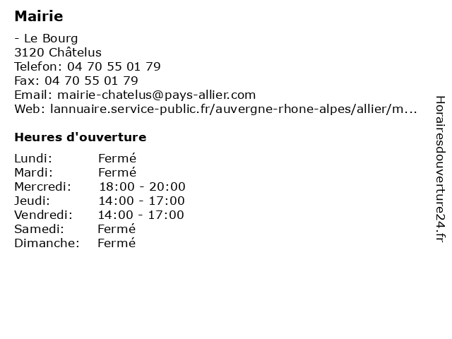 1 4 Mairie (Distance: 11,33 km) - Le Bourg, 03120 Barrais-Bussolles administration, mairie, public, service 6 |
