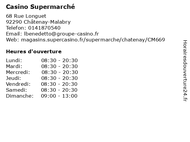 1 Casino Supermarché (Distance: 3,01 km) 34 Avenue de la Division Leclerc, 94260 Fresnes alimentaire, alimentation, casino, courses, distributeur, hypermarché, supermarché, épicerie 2 Casino Supermarché (Distance: 7,55 km) 352 Rue Lecourbe, 75015 Paris alimentation, boisson, casino, supermarché, épicerie 3 Casino Supermarché (Distance: 10,87 km) 16 Rue des Belles Feuilles, 75016 Paris alimentation, boisson, casino, supermarché, épicerie 4 Casino Supermarché (Distance: 11,42 km) - Rue Eugène Renault, 94700 Maisons-Alfort casino, hypermarche, magasin, services, supermarche, supermarché 5 Casino Supermarché (Distance: 15,02 km) 78 rue Martre, 92110 Clichy alimentation, casino, distribution, drive, epiceries, supermarché 6 Casino Supermarché (Distance: 15,07 km) 101 Boulevard Jean Jaurès, 92110 Clichy alimentation, boisson, casino, supermarché, épicerie  |