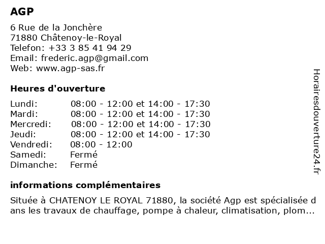 Située à CHATENOY LE ROYAL 71880, la société Agp est spécialisée dans les travaux de chauffage, pompe à chaleur, climatisation, plomberie et salle de bain. Nous assurons la pose, l'entretien...
