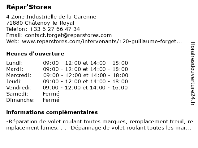 2 Gerard Terrand Menuiserie (Distance: 26,32 km) 72 route de Challanges, 21200 Beaune fenêtes, fermetures, gerard, installation, menuiserie, portes, rénovation, stores, terrand 3 ASM Fermetures (Distance: 30,86 km) . rue Claude Boucher, 71450 Blanzy asm, fenêtres, fermetures, installation, menuiserie, portes, rénovation, stores 4 Claire's (Distance: 35,31 km) 25 Rue Carnot, 71300 Montceau-les-Mines accessories, claire's, jewelry, stores 5 Eureka (Distance: 40,59 km) 61 Rue Mal de Lattre de Tassigny, 01190 Pont De Vaux eureka, hardware, shop, stores 6 |