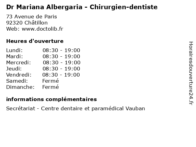 1 Dr Mariana Albergaria - Chirurgien-dentiste (Distance: 7,12 km) 90 Rue Marat, 94200 Ivry-sur-Seine albergaria, chirurgien, dentiste, dr, mariana, médecin, médecine, médical, pharmaceutique, traitement 2 Dr Mariana Albergaria - Orthodontiste (Distance: 0,00 km) 73 Avenue de Paris, 92320 Châtillon albergaria, chirurgien, consultation, dentiste, docteur, dr, mariana, med, médecin, médecine, orthodontiste, secrétariat, traitement 3 Dr Mariana Albergaria - Orthodontiste (Distance: 0,00 km) 73 Avenue de Paris, 92320 Châtillon albergaria, chirurgien, consultation, dentiste, docteur, dr, mariana, med, médecin, médecine, orthodontiste, secrétariat, traitement 4 Dr Mariana Bratulescu -Chirurgien-dentiste (Distance: 4,24 km) 12 Rue Armand Moisant, 75015 Paris bratulescu, broca, centres, chirurgien, dentaires, dentiste, docteur, dr, et, generaliste, jack, mariana, medical, médicaux, senet, soin 5 Mariana Orlandi - Psychologue (Distance: 4,97 km) 32 Rue des Cordelières, 75013 Paris folie, mariana, orlandi, psychiatre, psychiatrie, psychiatrique, psychologue 6 Dr Mariana Burlacu - Chirurgien-dentiste (Distance: 7,13 km) 59 Rue Galilée, 75008 Paris burlacu, chirurgien, dent, dentiste, docteur, dr, mariana, soins |