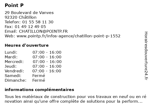 2 Point P (Distance: 4,33 km) . Port de Javel Bas, 75015 Paris aménagement, construction, matériaux, point, quinçaillerie, équipement 3 Point P (Distance: 6,30 km) 113 Avenue de Verdun, 94200 Ivry-sur-Seine aménagement, construction, equipement, matériaux, point, point.p 4 Point P (Distance: 9,37 km) 4 Route de la Bonde, 91300 Massy aménagement, construction, equipement, matériaux, point, point.p 5 Point P (Distance: 10,10 km) 19 Quai de la Révolution, 94140 Alfortville aménagement, construction, equipement, matériaux, point, point.p 6 Point P (Distance: 10,89 km) 11 Rue Porte de Buc, 78000 Versailles aménagement, construction, matériaux, point, point.p, quinçaillerie, équipement |