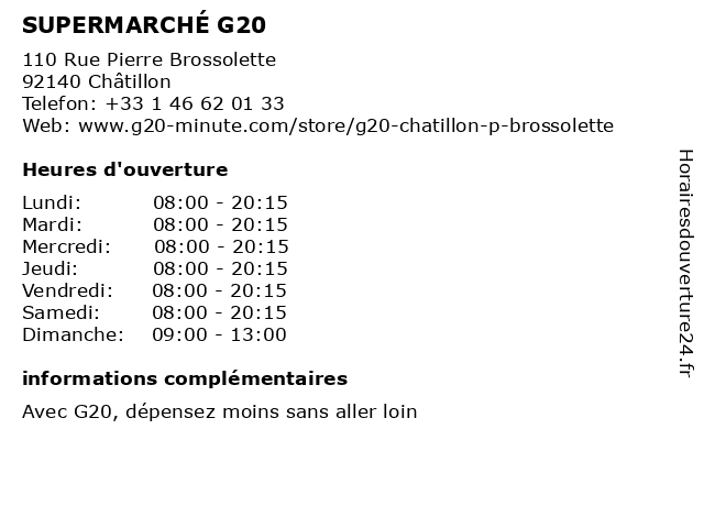 3 SUPERMARCHÉ G20 (Distance: 6,18 km) 22 Rue Duban, 75016 Paris champagnes, commerce de proximité, g20, livraisons, produits du quotidien, spiritueux, supermarché, vins 5 Supermarché G20 (Distance: 6,51 km) 10 rue Jean Bart, 75006 Paris carte bleue, carte g2, dépôt de pain, dépôt pressing, g20, livraison à domicile, photocopieur, supermarché, supermarket 6 Supermarché G20 (Distance: 6,84 km) 71 rue de Rennes, 75006 Paris carte bleue, carte g2, dépôt de pain, dépôt pressing, g20, livraison à domicile, photocopieur, supermarché, supermarket |