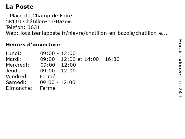 2 La Poste (Distance: 2,30 km) 115 Route de Brinay, 58110 Tamnay-en-Bazois agence, colis, courriers, expédition, la, postale, poste, relais 3 La Poste (Distance: 2,38 km) - Lieu Dit Le Bourg, 58110 Montapas agence postale, courrier postal, expédition internationale, la, poste 4 La Poste (Distance: 7,92 km) - Le Bourg, 58110 Tamnay-en-Bazois colis, courrier, enveloppe, envoi, la, lettres, livraison, paquets, poste, relais colis, timbres 5 La Poste (Distance: 8,28 km) - Route d'Achun, 58110 Aunay-en-Bazois agence postale, courrier postal, expédition internationale, la, poste 6 La Poste (Distance: 9,67 km) - Au Bourg, 58290 Limanton agence postale, courrier postal, expédition internationale, la, poste |