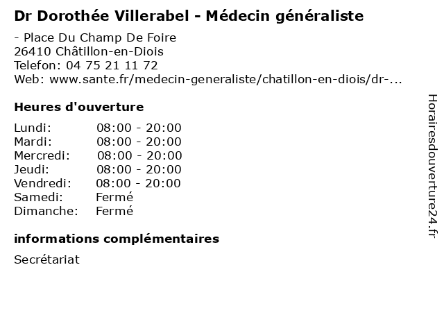 1 Dr Dorothée Villerabel - Médecin généraliste (Distance: 11,11 km) 17 Place du Marché, 26150 Die docteur, dorothee, dorothée, dr, generaliste, généraliste, medical, médecin, soin, villerabel 2 Dorothée Zielinski - Sage-femme (Distance: 44,84 km) 31 Rue des Charmilles, 26120 Montélier dorothee, dorothée, du, femme, maternité, périnée, rééducation, sage, uro-gynécologique, zielinski 3 Dr Dorothée Fagedet - Spécialiste en médecine interne (Distance: 49,00 km) 1 Place Auguste Muret, 05007 Gap consultation, docteur, dorothee, dorothée, dr, en, fagedet, interne, med, médecin, médecine, spécialiste, traitement 4 Dr Dorothée Brebant - Médecin généraliste (Distance: 49,62 km) - Rue Capitaine de Bresson, 05000 Gap brebant, docteur, dorothee, dorothée, dr, generaliste, généraliste, medical, médecin, soin 5 Dorothée Dany Chouteau (Distance: 56,46 km) 21 Rue Doyen Gosse, 38400 Saint-Martin-d'Hères chouteau, dany, dorothée 6 Maître Dorothée Riemain - Avocate (Distance: 57,88 km) 7 place Firmin Gautier, 38000 Grenoble avocate, avocats, civils, dorothée, droits, juridiques, maître, riemain |