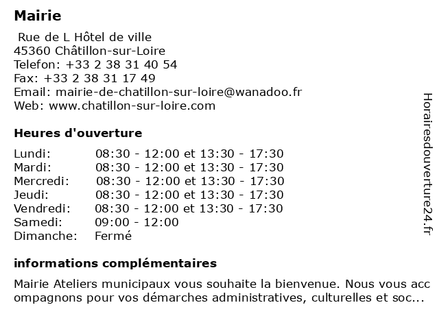 2 Mairie d'Ousson-sur-Loire (Distance: 2,51 km) n/a Place de l'Église, 45250 Ousson-sur-Loire administration, assoc, associations, aux, bussières, d'information, d'ousson, de, des, dédié, greffe, information, local, locale, loire, mairie, mission, personnes, point, sur 3 Mairie de Saint-Firmin-sur-Loire (Distance: 6,56 km) 32 Grande rue, 45360 Saint-Firmin-sur-Loire administration, assoc, associations, aux, bussières, d'information, de, des, dédié, firmin, greffe, information, local, locale, loire, mairie, mission, personnes, saint, sur 4 Mairie de Bonny-sur-Loire (Distance: 7,38 km) 15 avenue du Général-Leclerc, 45420 Bonny-sur-Loire administration, bonny, de, loire, mairie, service public, sur 5 Mairie de Saint-Martin-sur-Ocre (Distance: 11,28 km) 8 Grande rue, 89110 Saint-Martin-sur-Ocre administration, assoc, associations, aux, bussières, d'information, de, des, dédié, greffe, information, local, locale, mairie, martin, mission, ocre, personnes, saint, sur 6 Mairie d'Autry-le-Châtel (Distance: 11,45 km) 8 Rue de la Mairie, 45500 Autry-le-Châtel administration, châtel, d'autry, le, mairie, service public |