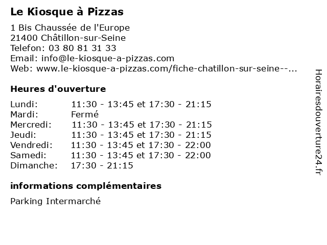 1 Le Kiosque à Pizzas (Distance: 31,24 km) 2 Avenue de la Gare, 10110 Bar-sur-Seine kios, kiosque, le, pizzas, restauration 2 Le Kiosque à Pizzas (Distance: 44,67 km) 43-45 Avenue Alfred Grévin, 89700 Tonnerre cuisine, kiosque, le, pizza, pizzas, pizzeria, rapide, restaurant 3 Le Kiosque à Pizzas (Distance: 55,38 km) 14 Rue François Mitterrand, 21120 Is-sur-Tille kiosque, le, pizza, pizzas, pizzeria, rapide, restaurant, restauration 4 Le Kiosque à Pizzas (Distance: 58,18 km) 142 Avenue Michel Baroin, 10800 Saint-Julien-les-Villas kiosque, le, pizza, pizzas, pizzeria, rapide, restaurant, restauration 5 Tabac Presse Amidieu (Distance: 58,48 km) 1 Avenue de Bourgogne, 52190 Vaux-sous-Aubigny amidieu, colis, depot, kiosque, magazines, presse, relais, tabac 6 Le Kiosque à Pizzas (Distance: 58,94 km) , Route d'Auxerre, 89800 Chablis kios, kiosque, le, pizza, pizzas, restauration |