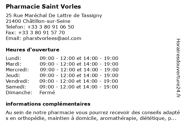 1 Hotel Le Saint Vorles (Distance: 0,20 km) 1 Rue Président Carnot, 21400 Châtillon-sur-Seine hotel, le, saint, vorles 2 Pharmacie Centrale de Chatillon (Distance: 0,12 km) 10 Rue Maréchal de Lattre de Tassigny, 21400 Chatillon Sur Seine centrale, chatillon, de, parapharmacie, pharmacie, pharmacien 3 Pharmacie Rive de Seine (Distance: 0,14 km) 6 rue du Maréchal de Lattre de Tassigny, 21400 Châtillon Sur Seine de, homéopathie, médicaments, orthopédie, parapharmacie, pharmacie, rive, seine 4 1001Pharmacies / Société Atelier Sarrasin (Distance: 31,51 km) 4 Rue Léon Fourney, 21500 Montbard 1001pharmacies, atelier, la médecine, la pharmacie, la santé, les soins, pharmacie, sarrasin, société 5 Pharmacie de la République (Distance: 31,98 km) 18, place de la République, 10110 Bar Sur Seine de, la, la médecine, la pharmacie, la santé, les soins, pharmacie, république 6 Pharmacie de Chaource (Distance: 35,97 km) 23 grande rue, 10210 Chaource chaource, de, pharmacie, services |