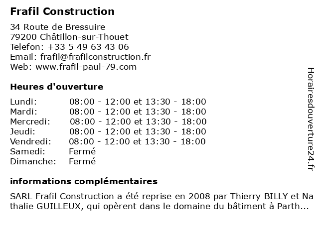 1 CMG Construction Maçonnerie Générale (Distance: 7,58 km) 4 Rue Principale, 79200 La Chapelle-Bertrand cmg, construction, générale, maçonnerie 2 Expertal' Construction (Distance: 8,59 km) Chemin du Fontagnoux au Grand-Cône, 79200 La Chapelle-Bertrand construction, expertal' 3 Frafil Laurent (Distance: 11,58 km) Route des Rambaudières, 79310 Saint-Pardoux-Soutiers frafil, laurent 4 GEF TP - Groupement Electrique Force (Distance: 1,09 km) 51 Avenue de la Morinière, 79200 Châtillon-sur-Thouet conception, construction, electrique, entretien, force, gef, groupement, public, réalisation, tp, travaux 5 Groupe GTR - Maisons du Marais (Distance: 2,50 km) 63 boulevard de la Mailleraye, 79200 Parthenay agence, construction, du, gestion, groupe, gtr, immobilier, maisons, marais, promoteur, transaction, vente 6 ADC - Groupe Fayat (Siège) (Distance: 2,86 km) - Rue Marcel Beau, 79201 Parthenay adc, chantier, construction, fayat, groupe, immobilier, siège, travaux |