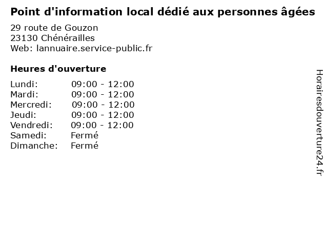 1 Point d'information local dédié aux personnes âgées (Distance: 0,00 km) 29 route de Gouzon, 23130 Chénérailles administration, aux, chénérailles, d'information, dédié, local, organismes, personnes, point, publics, services, âgées 2 Centre d'Information et d'Orientation (CIO) (Distance: 17,58 km) - Esplanade Charles-de-Gaulle, 23200 Aubusson centre, cio, d'information, d'orientation, documentation, et, information, jeunesse, metiers, orientation 3 Mairie de Blaudeix (Distance: 10,26 km) 1 rue de l'Église, 23140 Blaudeix administration, assoc, associations, aux, blaudeix, d'information, de, des, dédié, greffe, information, local, locale, mairie, mission, personnes, point, services, services publics, âgées 4 Mairie d'Alleyrat (Distance: 18,92 km) n/a Ribière, 23200 Alleyrat administration, assoc, associations, aux, d'alleyrat, d'information, des, dédié, greffe, information, local, locale, mairie, mission, personnes, point, services, services publics, âgées 5 Point d'information local dédié aux personnes âgées (Distance: 24,55 km) 11 rue de Paris, 23000 Guéret administration, assoc, associations, aux, d'information, des, dédié, greffe, information, local, locale, mission, personnes, point, services, services publics, âgées 6 Mairie de Basville (Distance: 37,18 km) n/a Le Bourg, 23260 Basville administration, assoc, associations, aux, basville, d'information, de, des, dédié, greffe, information, local, locale, mairie, mission, personnes, point, services, services publics, âgées |