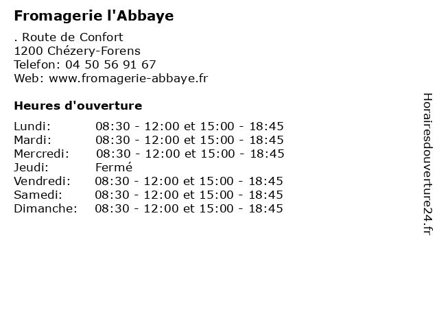 1 Fromagerie l'Abbaye (Distance: 7,20 km) s/n Route de Confort, 01410 Chézery-Forens fromagerie, l'abbaye, services 2 Fromagerie de l'Abbaye (Distance: 7,50 km) 266 Route de Confort, 01410 Chézery-Forens de, fromagerie, l'abbaye 3 Fromagerie Bouchet (Distance: 11,11 km) 101 Route de Faramaz, 74520 Vulbens bouchet, boutique, fromagerie, vulbens 4 FROMAGERIE SEIGNEMARTIN (Distance: 16,35 km) 350 Rue De La Gelinotte, 01130 Nantua fromagerie, seignemartin 5 Fromagerie Le Chat-Bo (Distance: 16,36 km) 18 Rue Brillat Savarin, 01100 Oyonnax bo, boutique, chat, fromagerie, le 6 Fromagerie Bouchet (Distance: 18,31 km) 30 Rue de Genève, 01630 Saint-Genis-Pouilly bouchet, boutique, fromagerie, la |