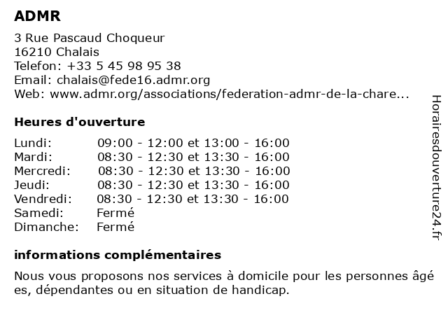 5 ADMR DE SAINTONGE SUD (Distance: 19,60 km) 26 Route de Royan, 17270 Saint-Martin-d'Ary admr, de, saintonge, sud 6 |